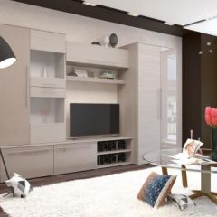 Современная стенка с глянцевыми элементами на фасаде лаконично впишется в интерьер вашей гостиной. Гармоничность форм подчеркивается чудесным выбором сочетающихся друг с другом цветов: глянцевая лакированная отделка цвета КАКАО и благородный ЯСЕНЬ шимо светлый.