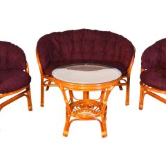 Комплект из натурального ротанга, состоящий из дивана, двух кресел и круглого столика со стеклом.