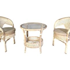 Комплект мебели Пеланги 02/15 включает в себя: 2 кресла и столик с красивым плетением снизу и полочкой, съемные подушки из материала улучшенного качества.